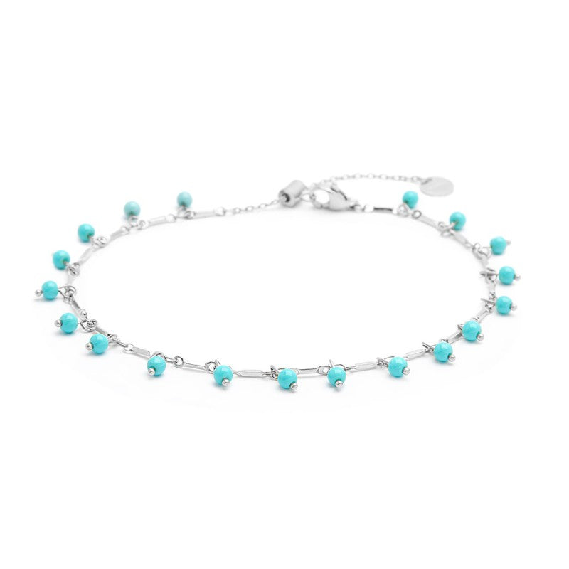Cavigliera in acciaio con catena a barre con pietre turchesi pendenti. Lunghezza totale 26 cm, regolabile da 26 a 21,5 cm tramite cursore. Marlù logo tag presente all'estremità.