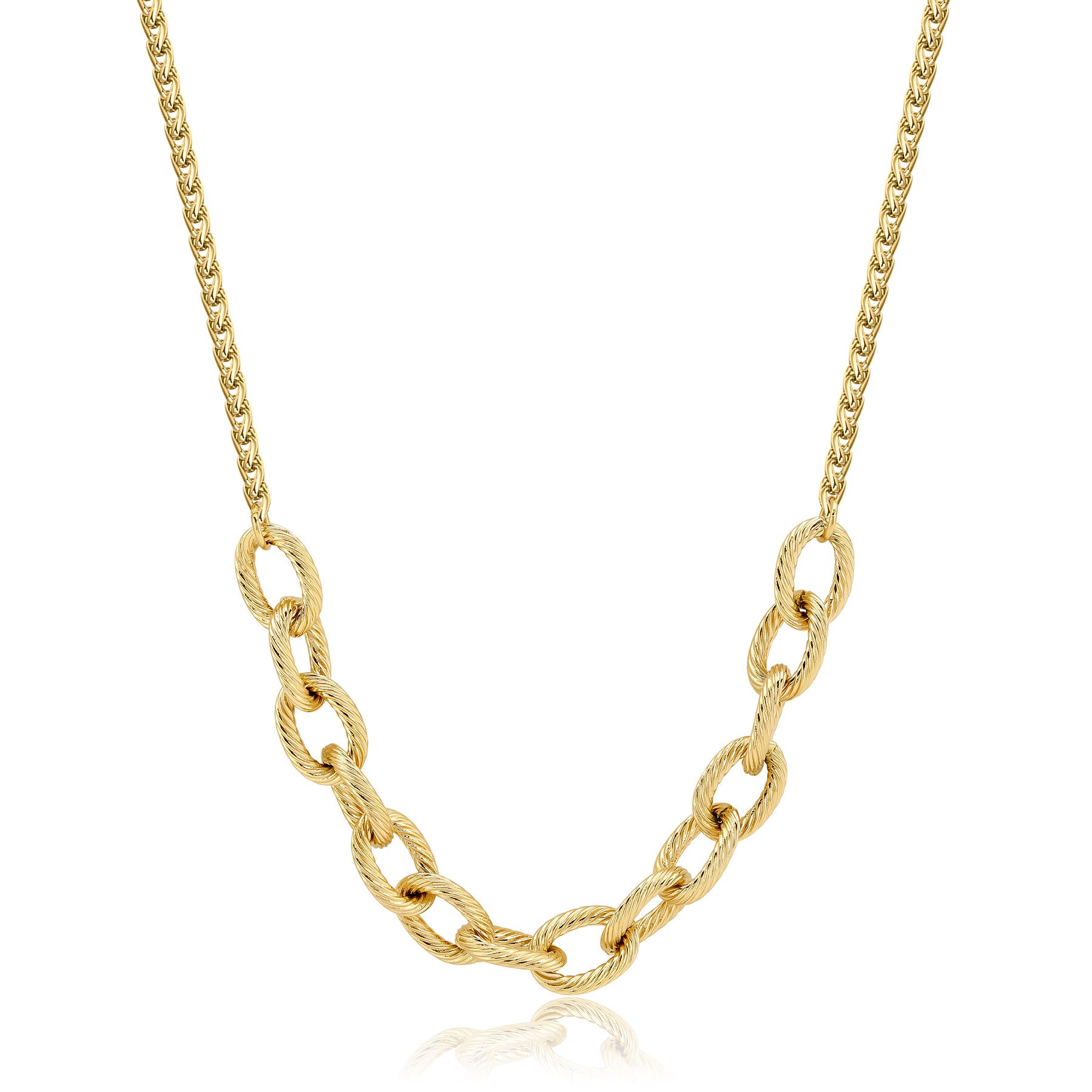 Collana girocollo con catena spiga e rolò lavorata in acciaio 316L e finitura pvd oro 14K.