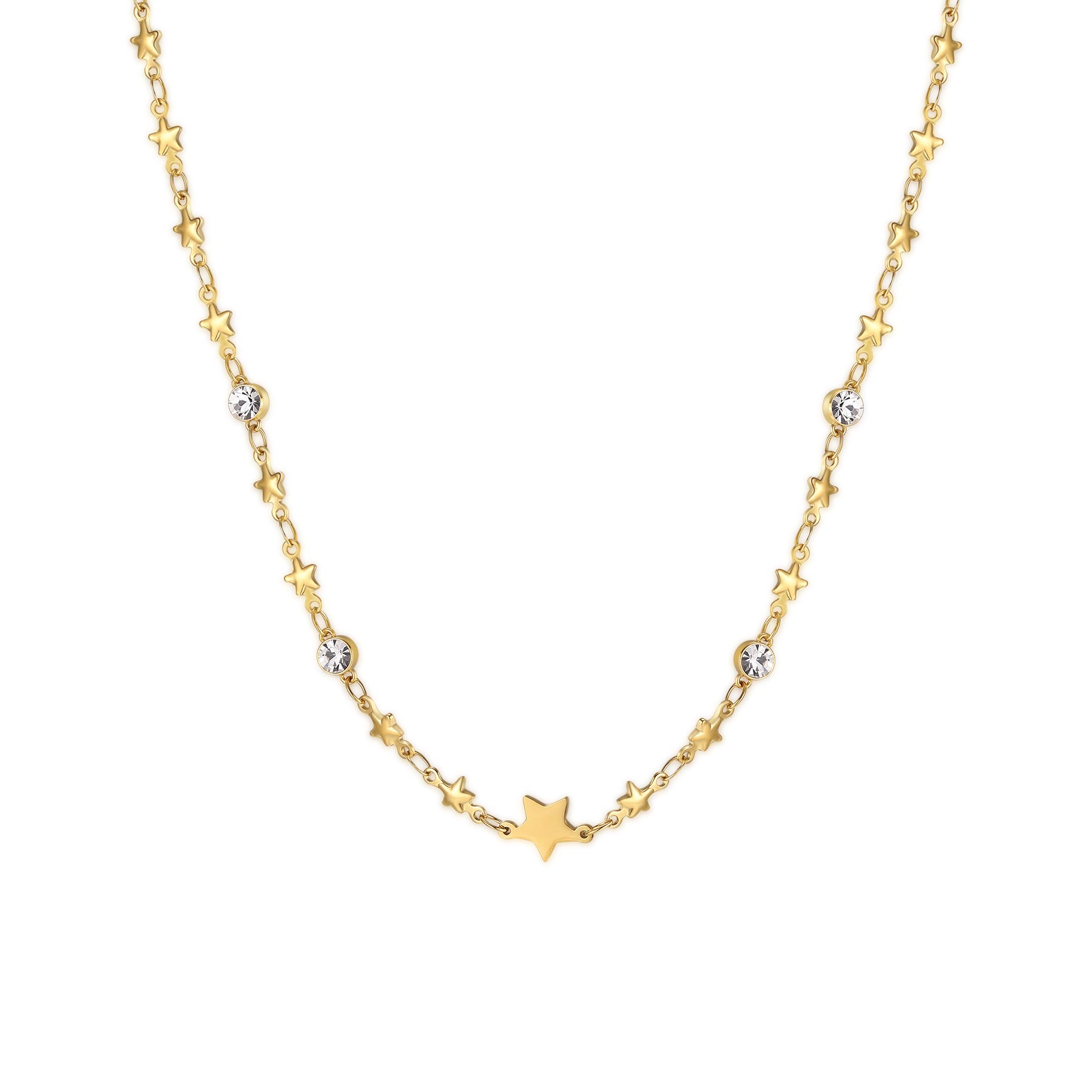 Collana girocollo in acciaio 316L, finitura pvd oro 14K con stelle e cristalli.