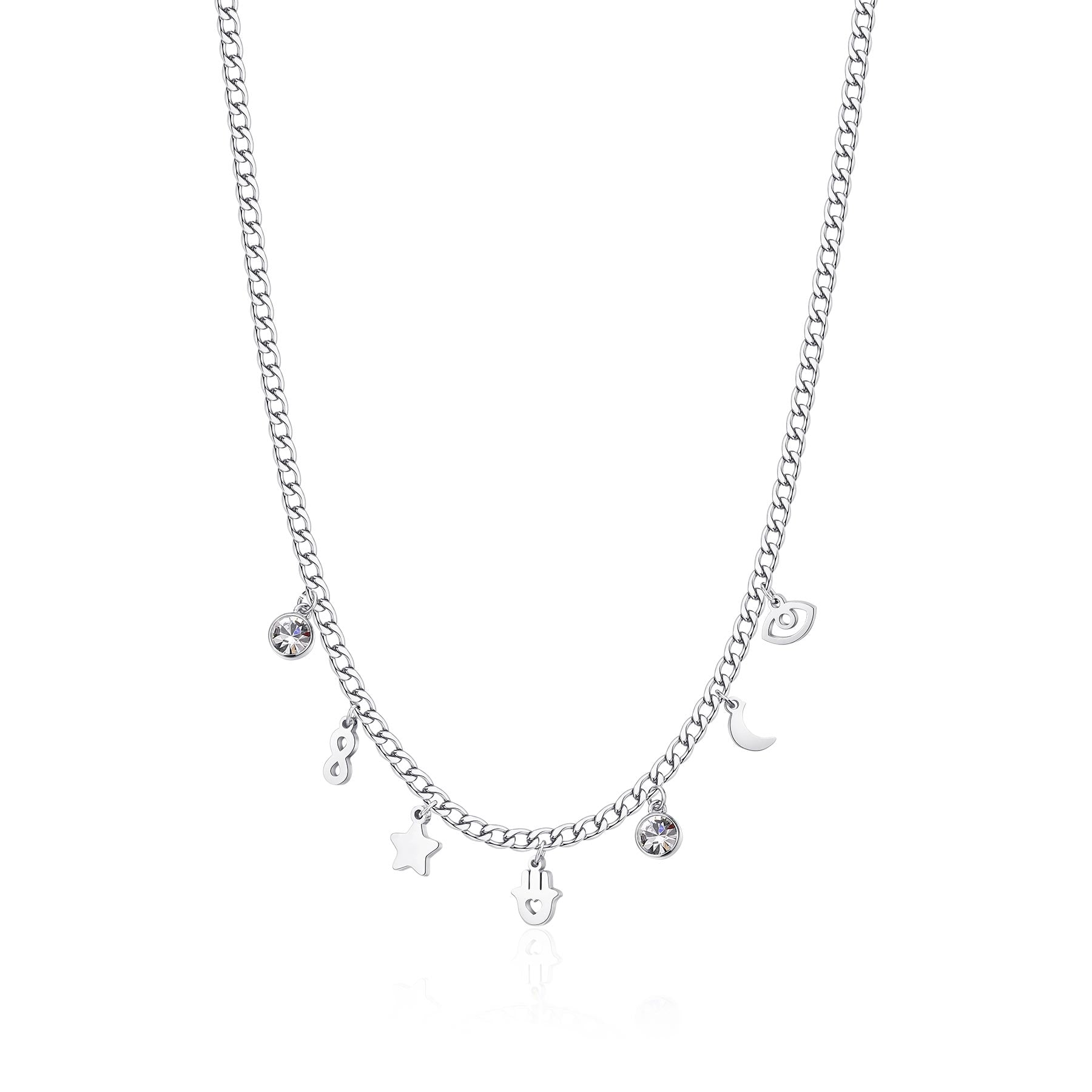 Collana catena grumetta in acciaio 316L con pendenti a forma di infinito, stella, mano di fatima, luna, occhio e cristalli.