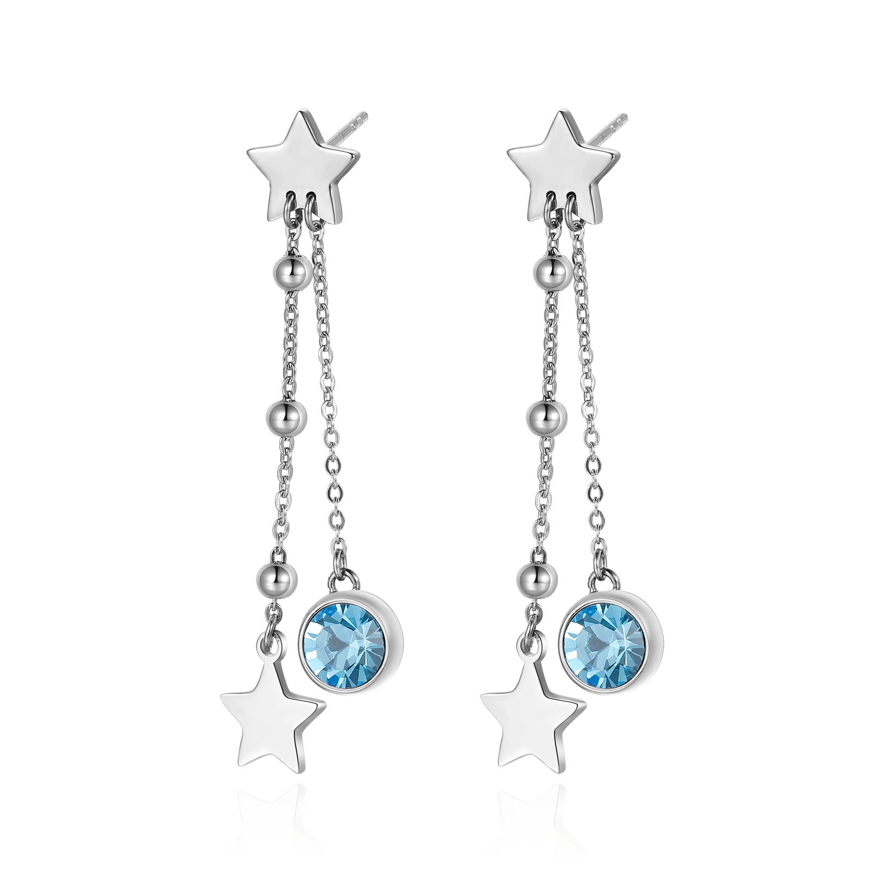 Orecchini pendenti in acciaio 316L con pendente a forma di stella e cristallo aquamarine.