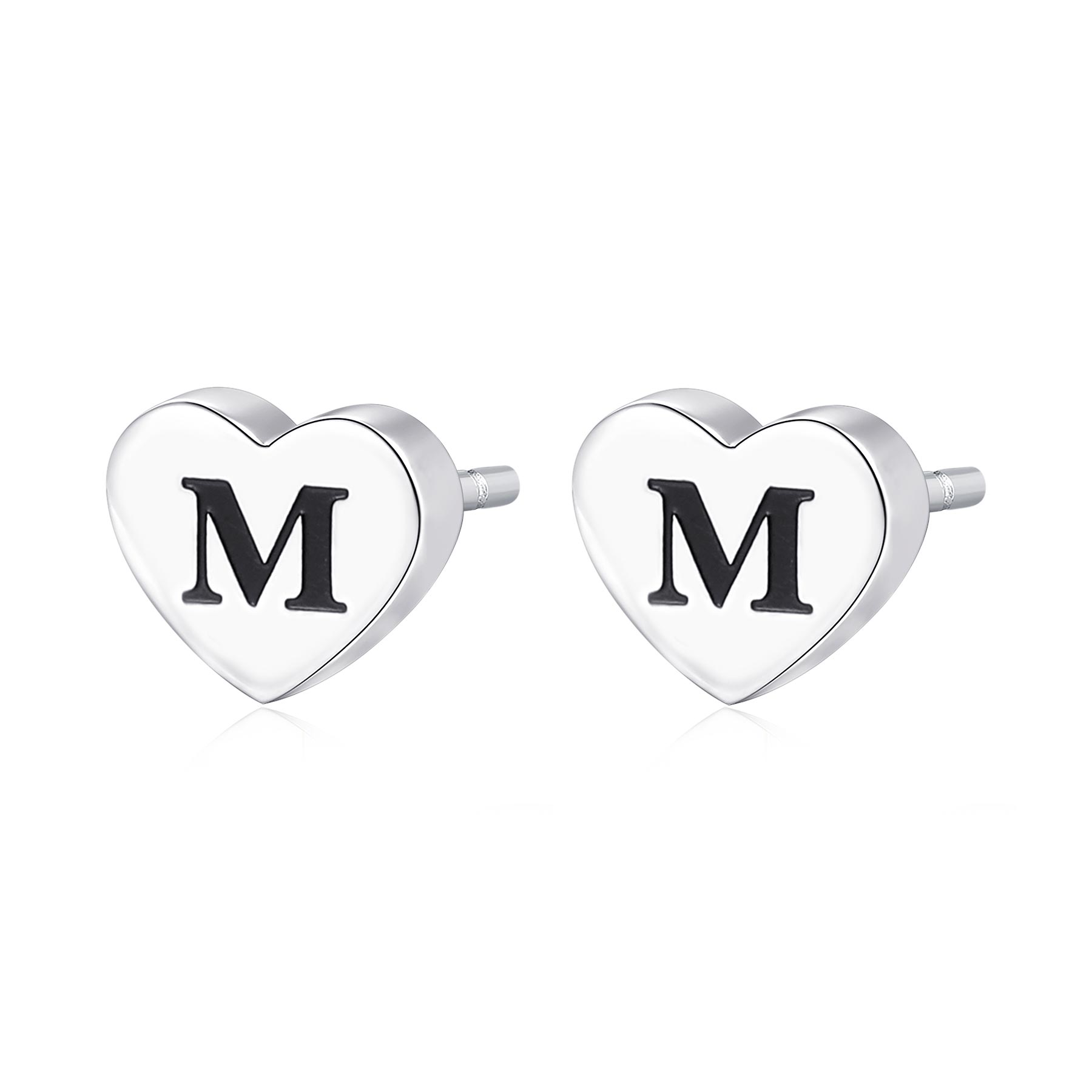Orecchini a lobo a forma di cuore in acciaio 316L con lettera M e smalto nero.