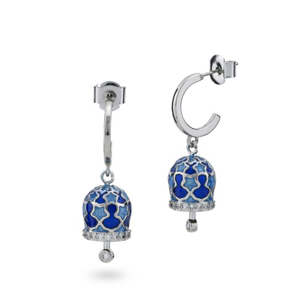 Orecchini e campanelle pendenti in bronzo rodiato con cuori azzurri su base bianco perlata, impreziositi da zirconi.