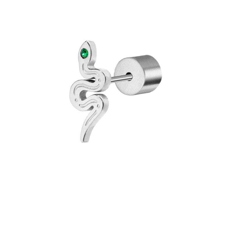 Mono orecchino a lobo a forma di serpente con cristallo verde e trama incisa.