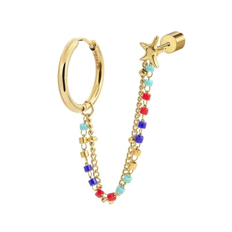 Mono orecchino "multindosso" a cerchio con diametro 1,6 cm, la chiusura è a pressione. Il pendente con doppia catena è removibile: la prima è una catena a grumetta con sfere in acciaio. La seconda è composta da miyuki. Mono orecchino removibile a forma di stella marina nella parte inferiore del pendente. Lunghezza totale 7 cm. Collezione: TMT29