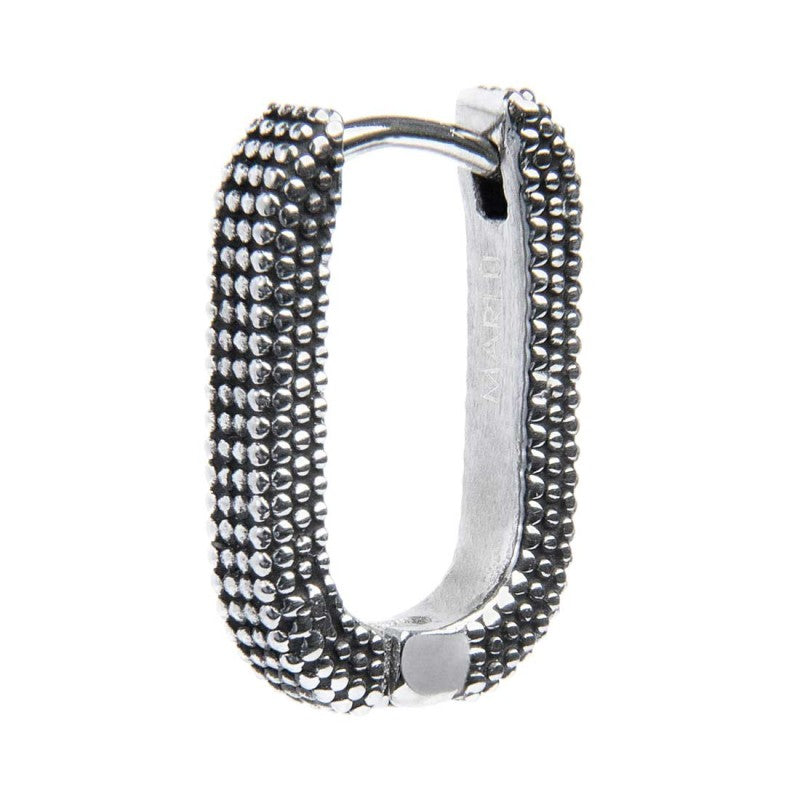 Mono orecchino in acciaio ovale 1,1*1,6 cm, con trama puntinata con black oil opaco. Chiusura a pressione. Logo Marlù laserato nella parte interna. Materiali: acciaio, black oil opaco