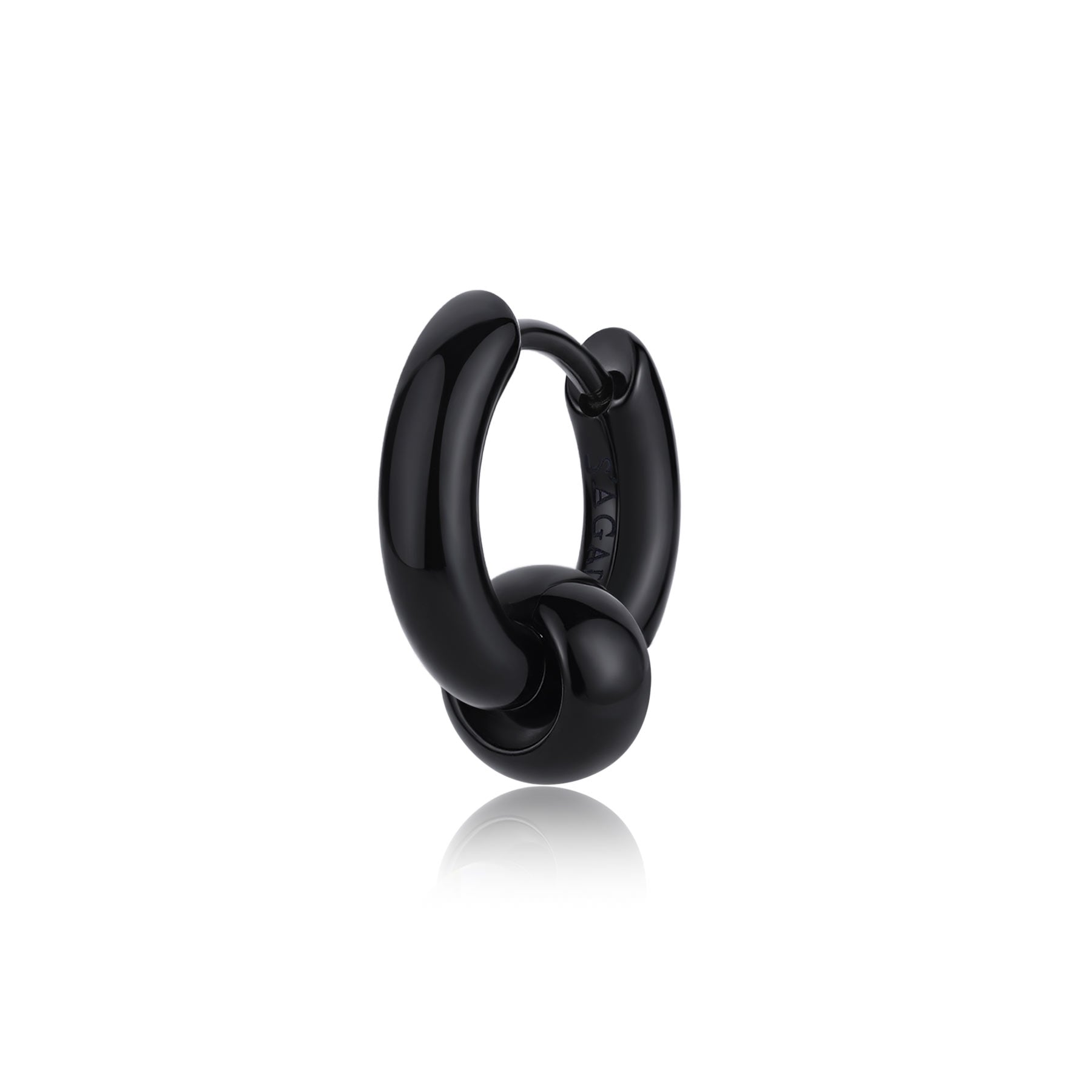 Orecchino singolo a cerchio in acciaio 316L e finitura pvd nero con dettaglio pendente.